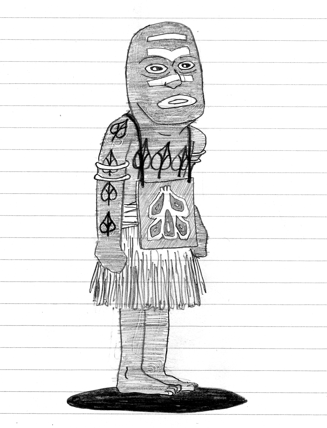 黒い肌を持ち、胸と背にヤムイモ、両腕に4枚の葉の絵があり、独身の証の前だれをつけた姿の彫像が数多く残っている。