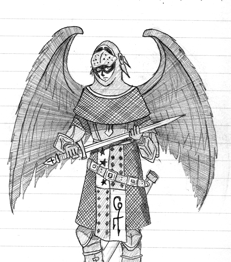2枚の翼を持ち、槍を持った兵士、または助祭の姿をしている。
