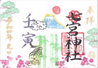 令和4年の正月にいただけた御朱印です。見開きサイズのものは色みくじをひき、出た色で「壬寅」と揮毫していただけました。