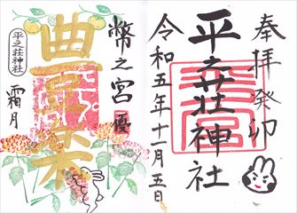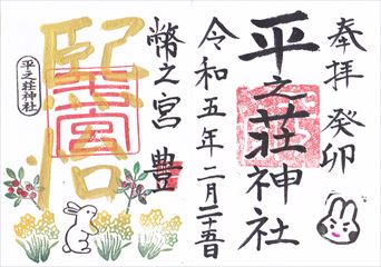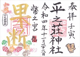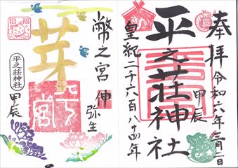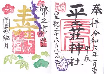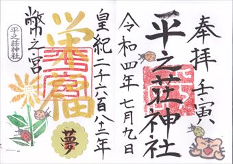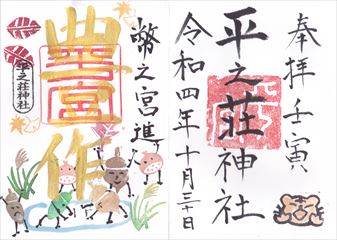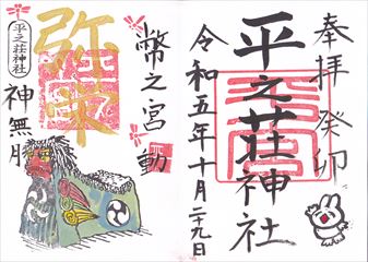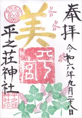 兵庫県加古川市に鎮座する平之荘神社の御朱印です。見開き2面で授与していただけます。