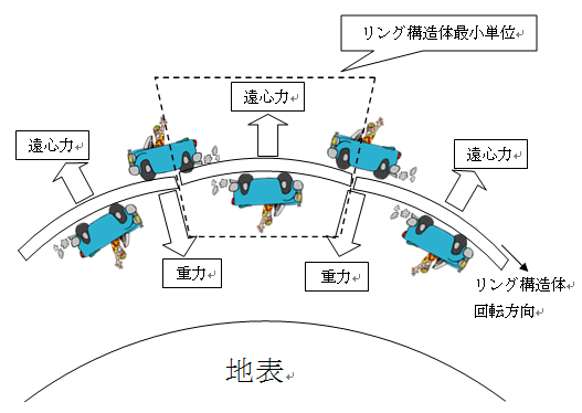 リング構造体の最小単位の上下を常に1台の車が存在しているような状況を作れば、上の車が引き起こす落下力(重力)と下の車が引き起こす上昇力(遠心力)が釣り合うことになり、リング構造体は落下も上昇もしない安定状態を作ることができる。(下図参照)