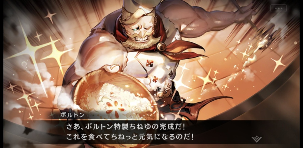 OD | 楽しい楽しい食事の時間だ | 4 | 複 | 範囲回復 範囲内の味方の最大HPを18%回復する 範囲内の味方の攻撃力を30%上げる(2ターン)【範囲内に他の味方がいる時】 自身の攻撃力と防御力を70%上げる(3ターン)【範囲内に自身しかいない時】 |