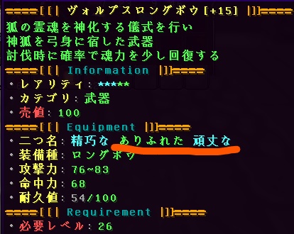 武器についている2つ名の部分を変更できます。金,紫,水,青,赤,濃赤の順に性能が高いです。