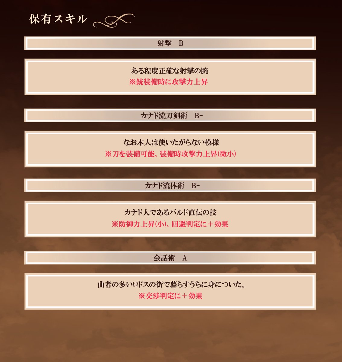 カナド人であるバルドから技を教わったため、ある程度の剣術は心得ているが射撃の方が得意。