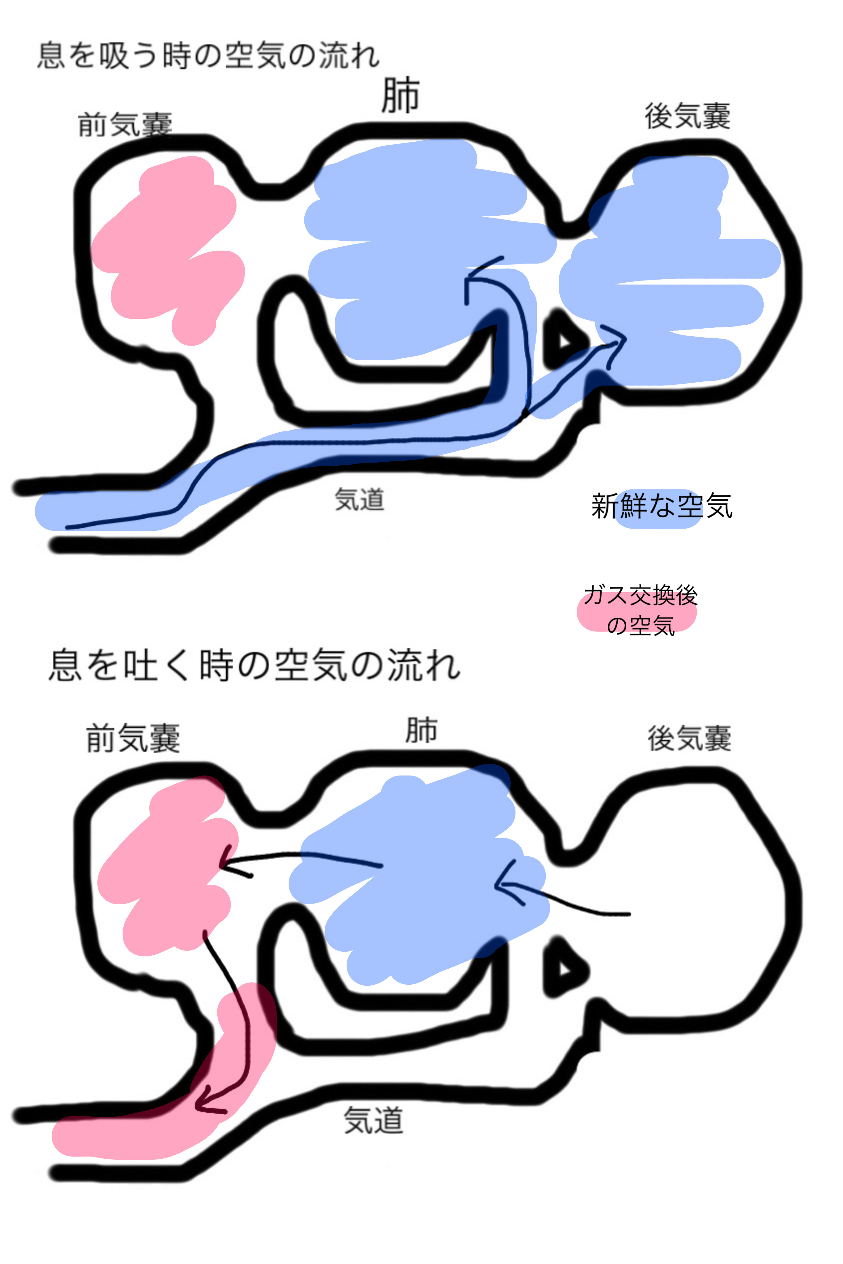 2.息を吐くときには、前気嚢に溜められている前回の呼吸時の空気を気道に押し出す形で肺から前気嚢に空気が送られ、次の呼吸まで一旦貯められる。これと同時に肺には後気嚢から新鮮な空気が供給される。