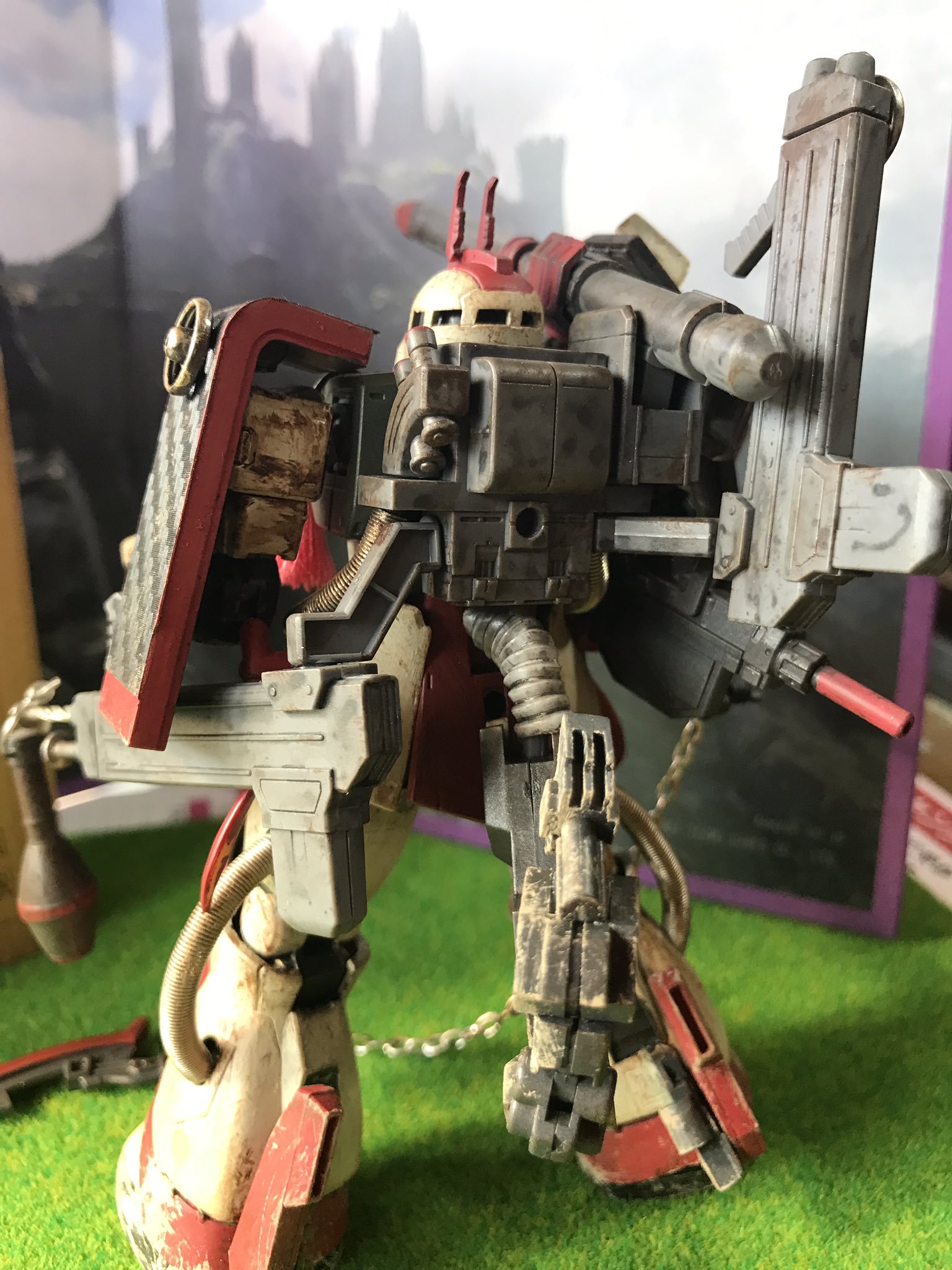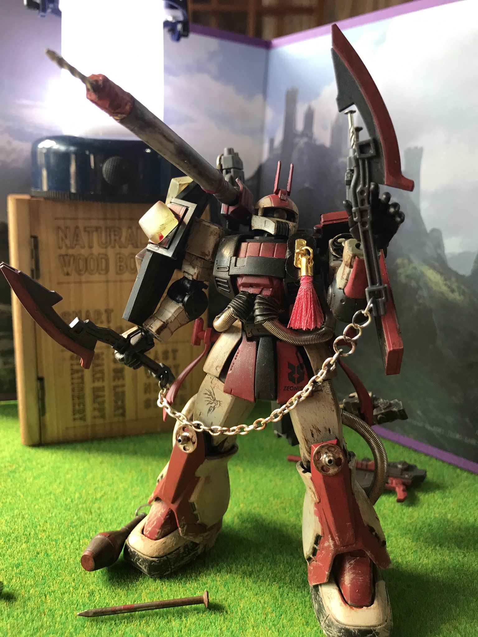 ただしこの機体は運用の都合上、城壁に取りついてしばらくの間、身動きが取れなくなる。この間、敵機に狙われ易くなることは言うまでもない。それを想定し、大型のツインアンテナや、両肩に特殊加工をしたシールドを装備している。両足と腰部には、バンカーラムの強烈な反動に耐える必要上から、位置固定のための補助足が装備されている。