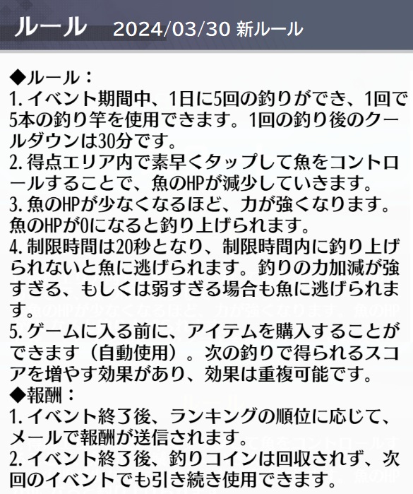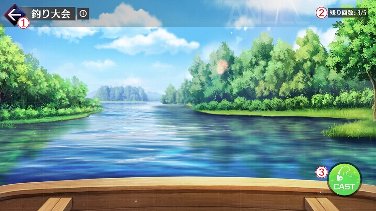 CASTボタン クリックで糸を投げる。 クリック前ならイベントページに戻って ショップでアイテム購入可能で、 CAST回数は消費しない |