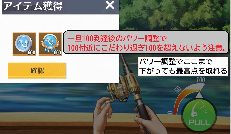 得点エリアで保持して釣り上げると最高得点(600点)が出せる。