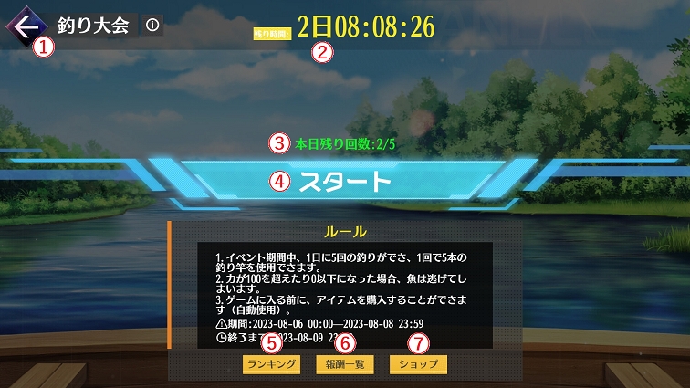 3 | 本日の残り参加回数 | 4 | スタート:釣り開始ボタン |