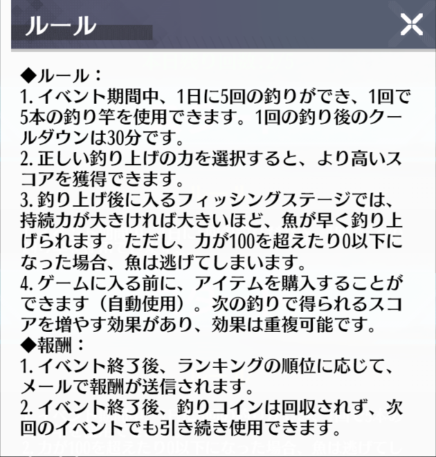 釣り参加回数ではなく、 残りCAST回数 これがゼロになると、 休憩(CT)が始まる |