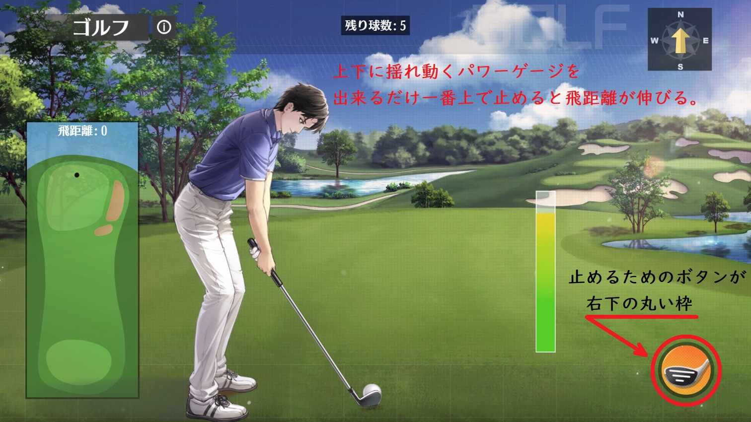 遊び方① ※ここで振り子を止める前ならゴルフ場を退出してアイテムを購入しに行ける |