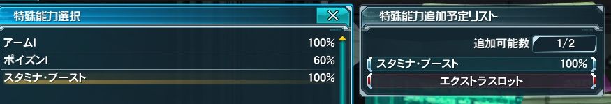 では、最終的にALL100%を目指す例として「テクニックⅢ・ラグネソール・スタミナブースト」の3スロ装備を作るとしましょう。(メイン装備のスロ開発は終わってる前提)