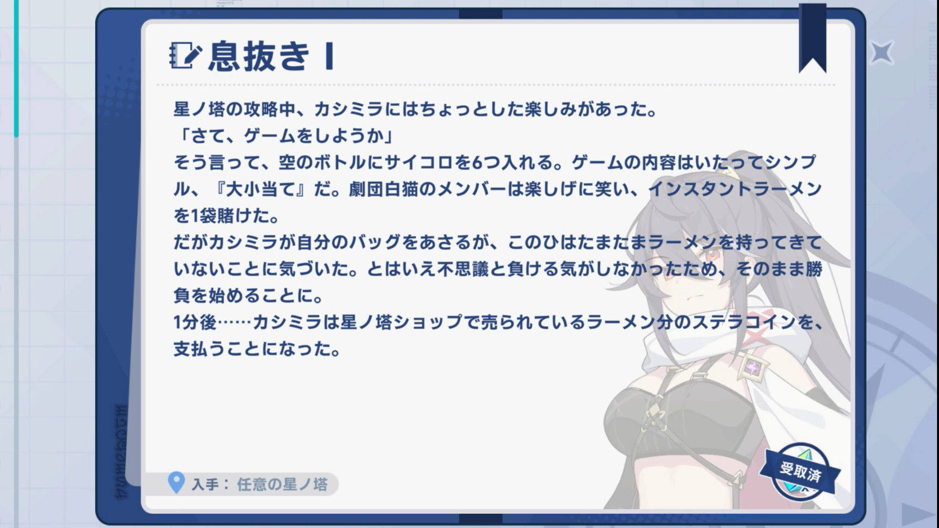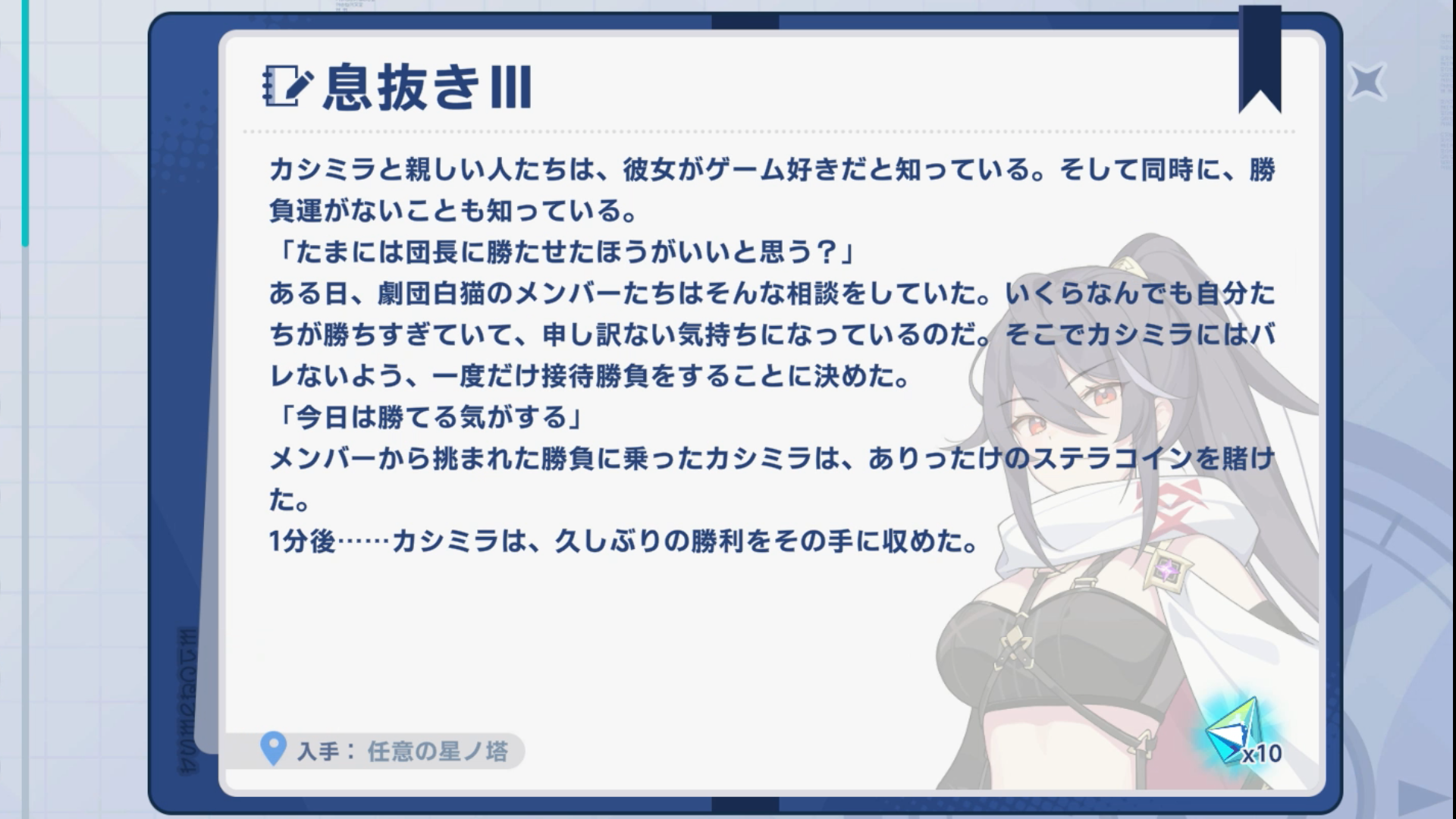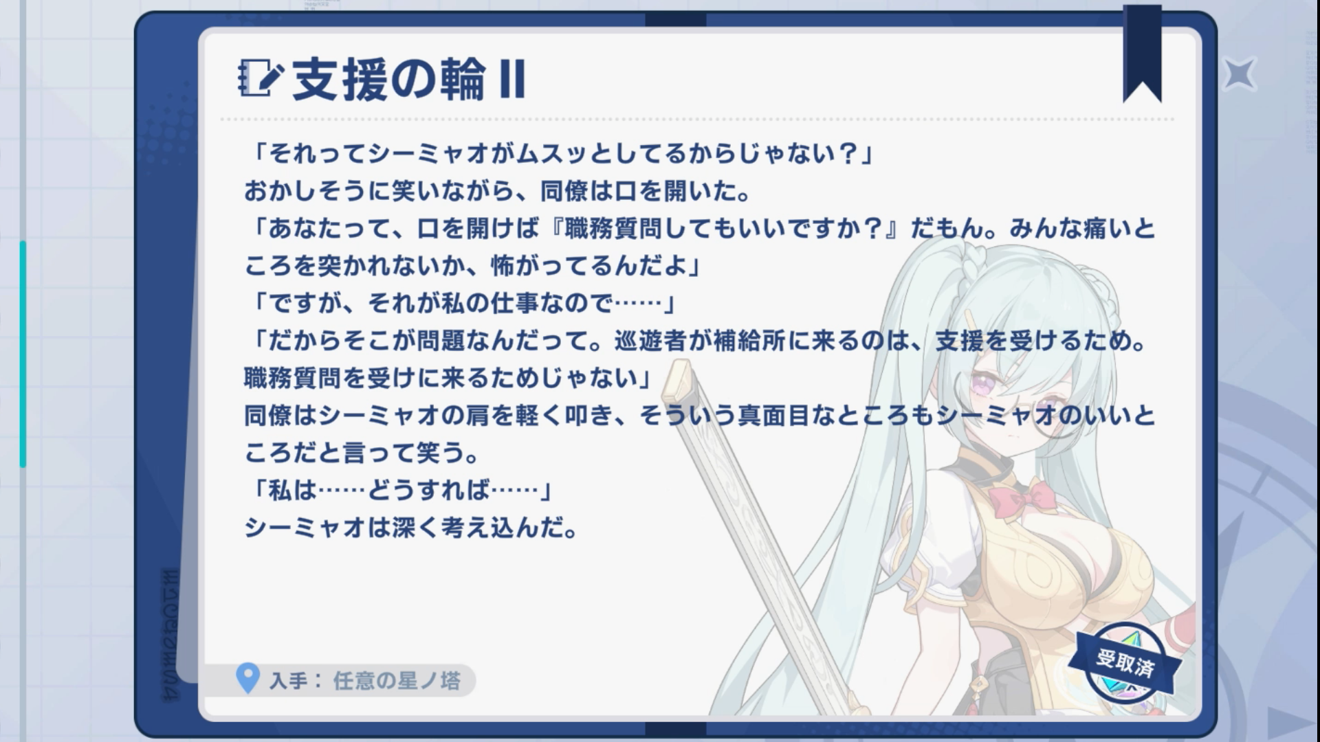 星ノ塔探索で入手できます。おそらく対象NPCとの対話が入手条件です。1枚解放するごとに