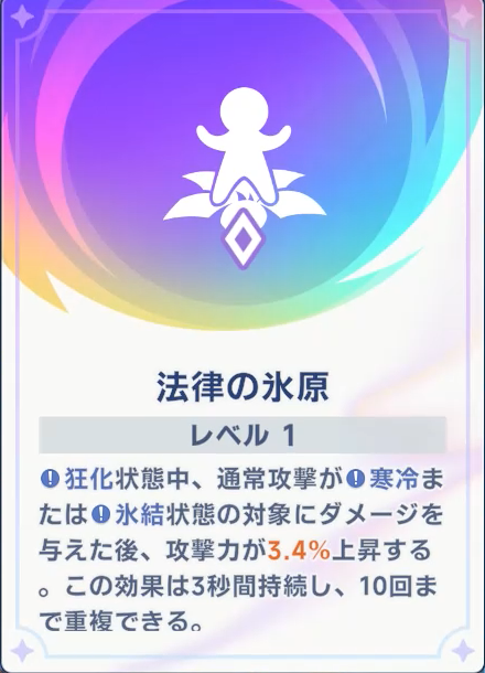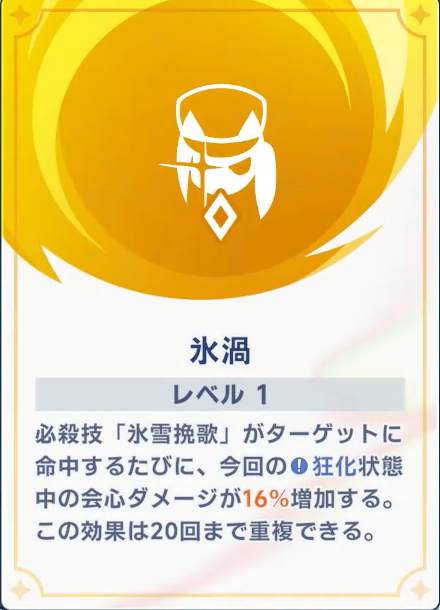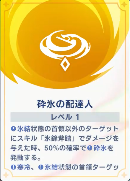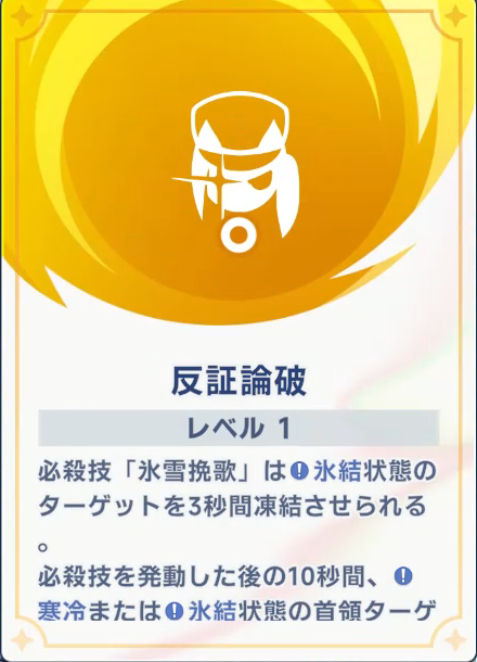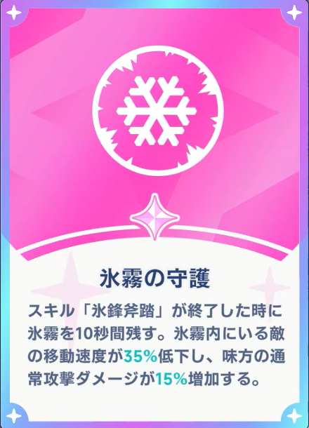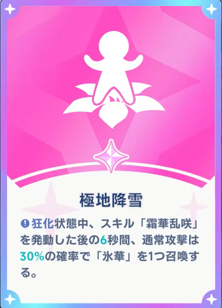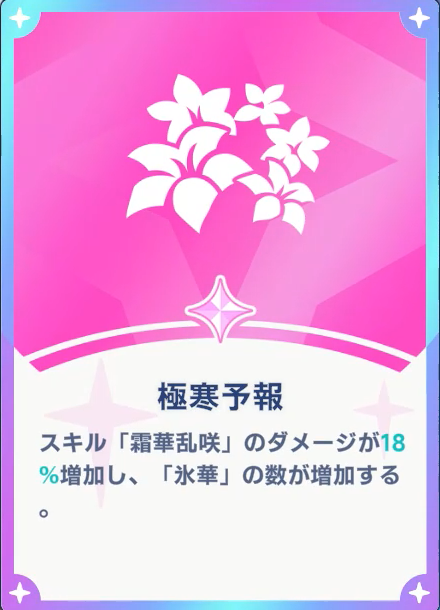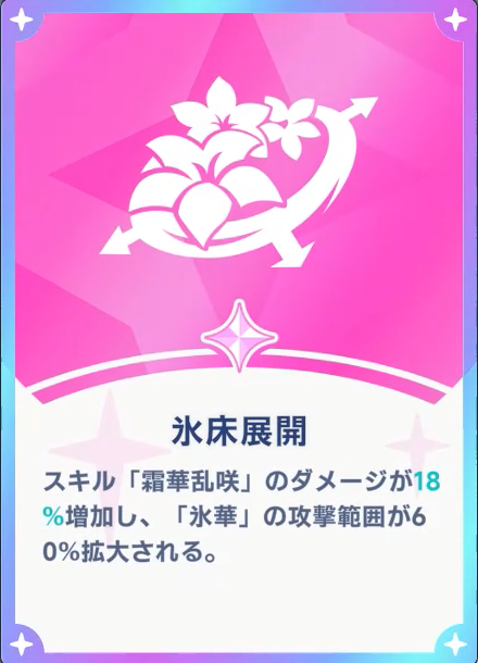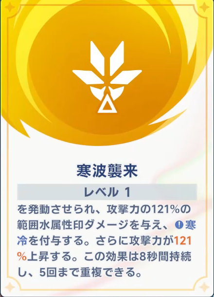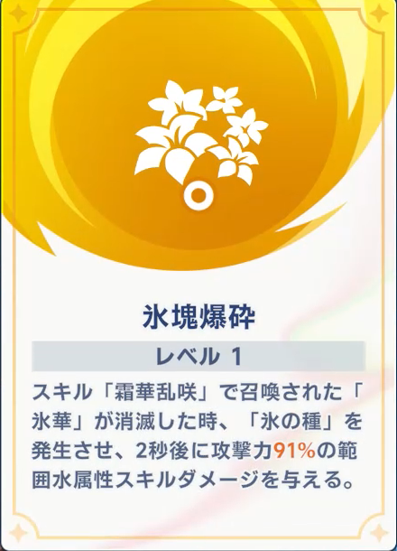 前方に大量の「氷華」を生成し、攻撃力の42%の範囲水ダメージを与える。 「氷華」は生成から1秒後に爆裂し、攻撃力の60%の範囲水属性ダメージを与える。 「氷華」がダメージを与えるたびに、水属性の印:水流を付与する。 |