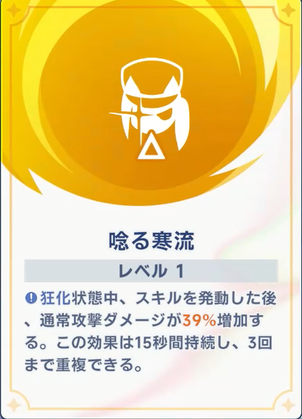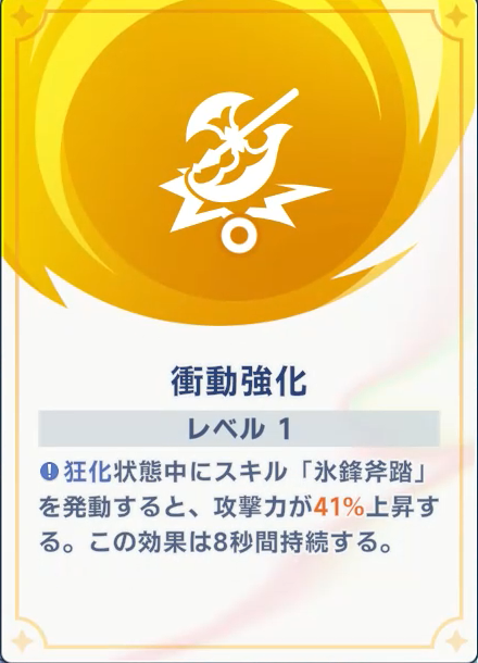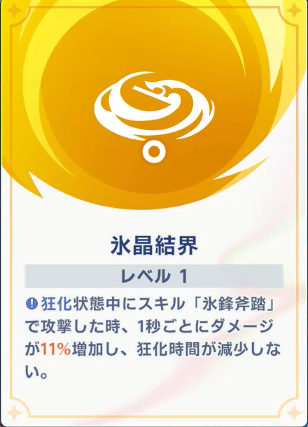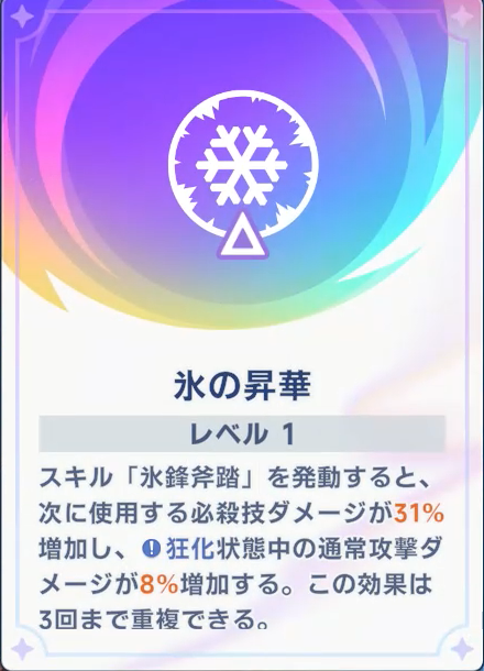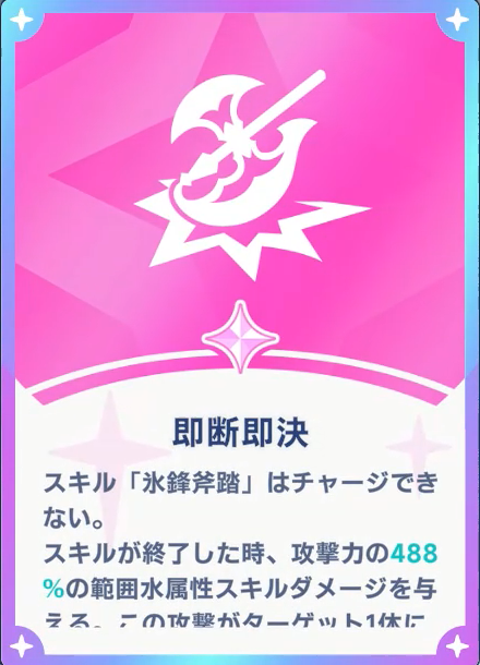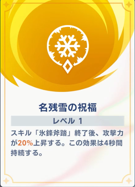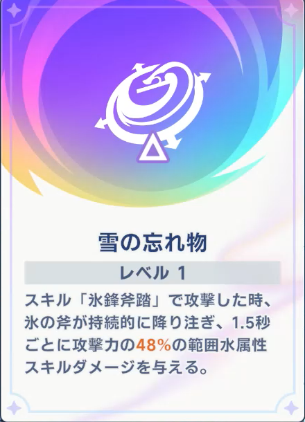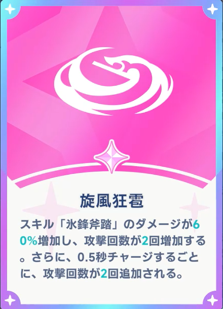 チャージ後に旋風斬りを発動し、0.4秒ごとに付近のターゲットに攻撃力の42%の水属性ダメージを与える。この効果はチャージすると持続時間が延長される。 「氷鋒斧踏」が水属性の印を発動させた時、攻撃力の107%の範囲水属性ダメージを与え、寒冷を付与する。 |