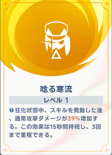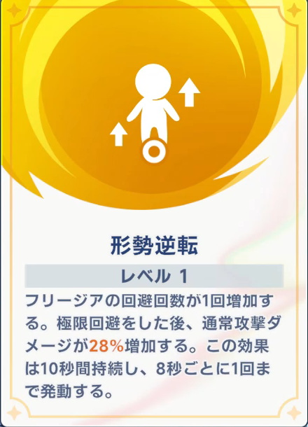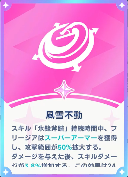 フリージアが【寒冷】または【氷結】状態のターゲットにダメージを与えた後、会心ダメージが40%増加する。この効果は6秒間持続する。