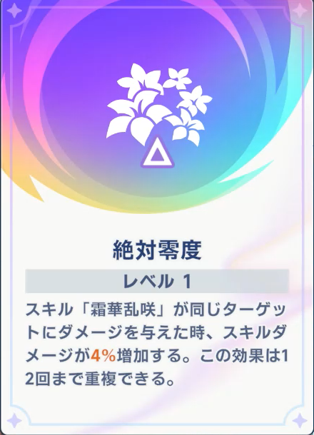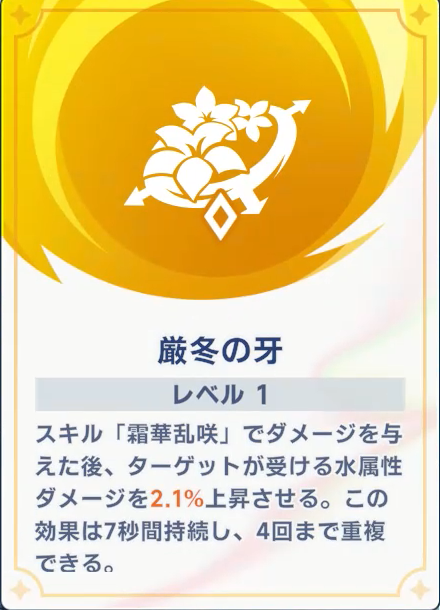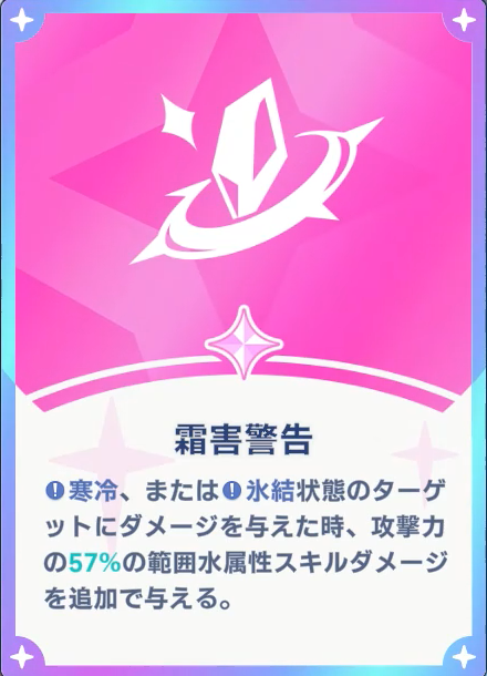 フリージアがターゲットにスキルダメージを与えるたびに、そのターゲットが受ける水属性ダメージが2%増加する。この効果は14秒間持続し、10回まで重複できる。