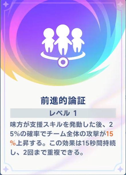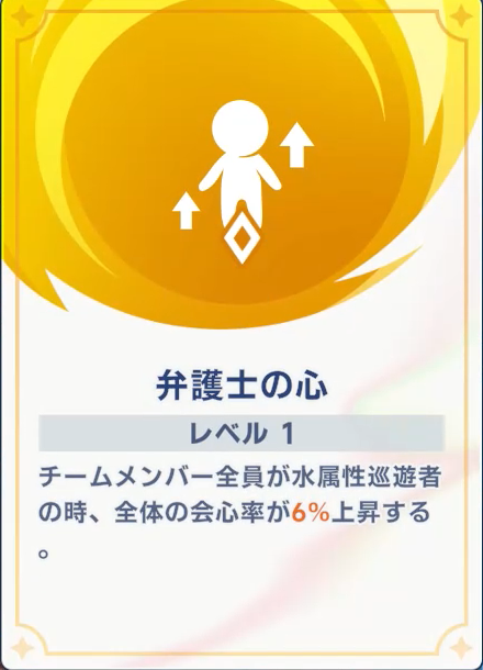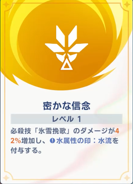 完凸:HP+5750、攻撃力+15.0%、攻撃力+500、防御+100、水属性ダメージ+15.0%