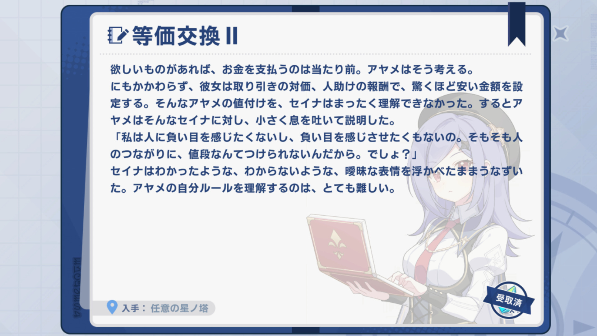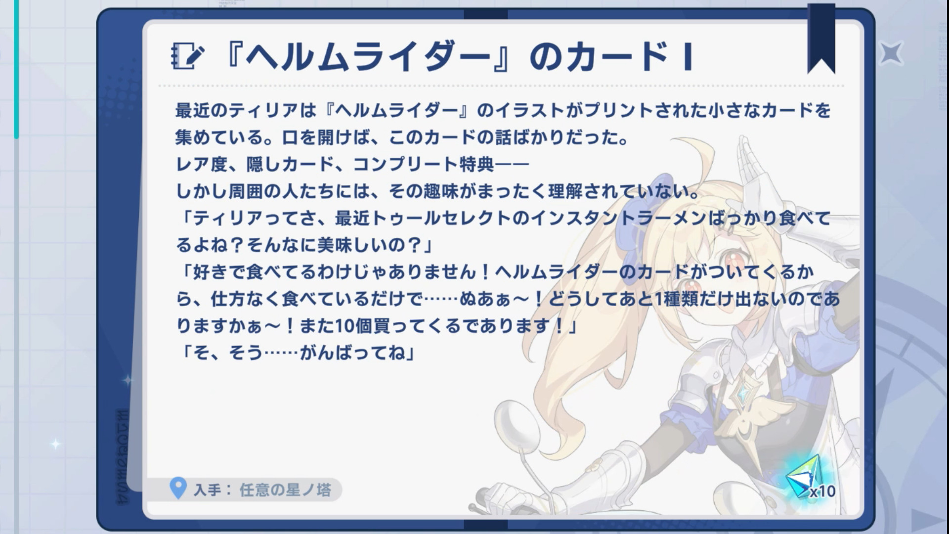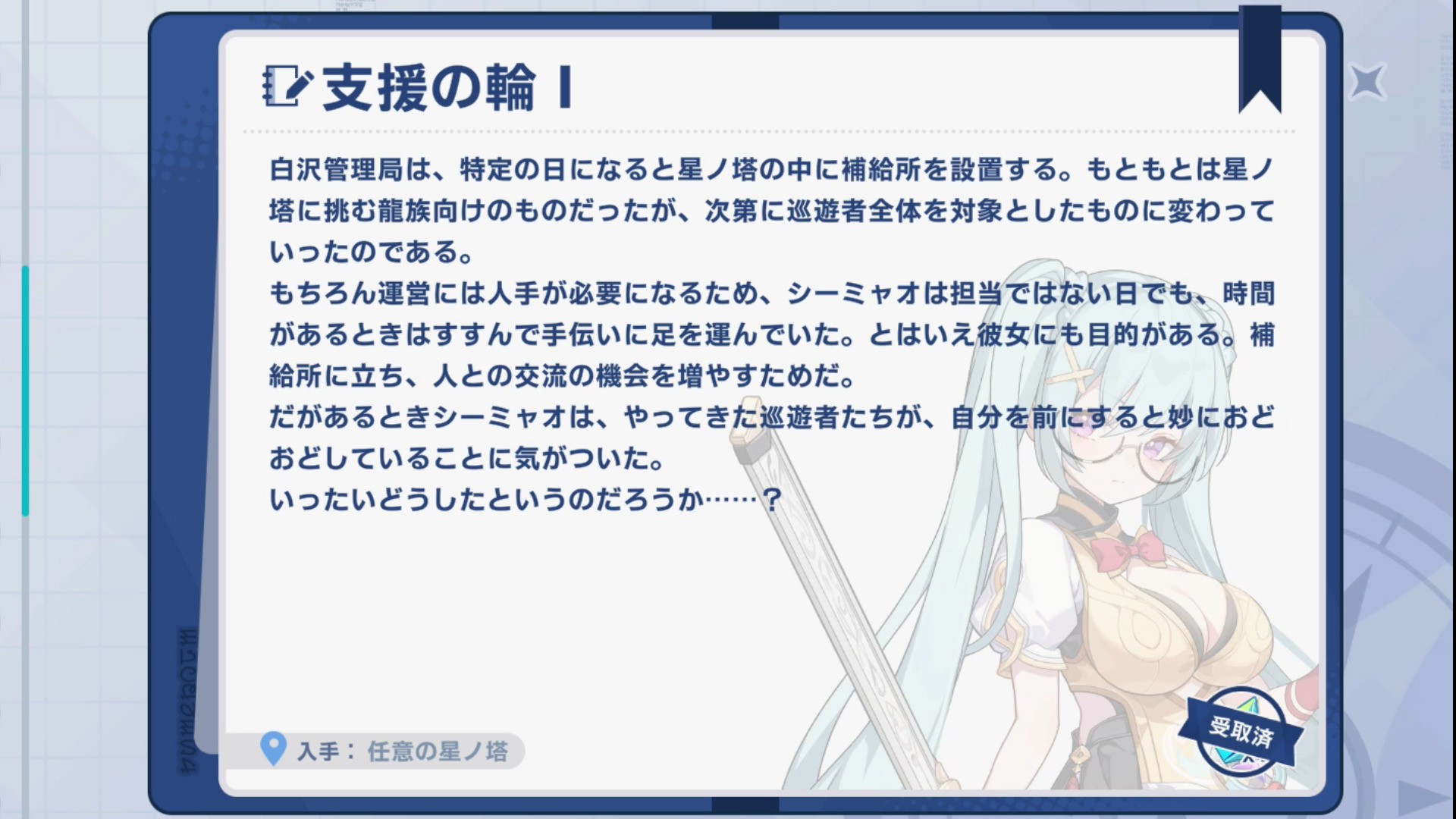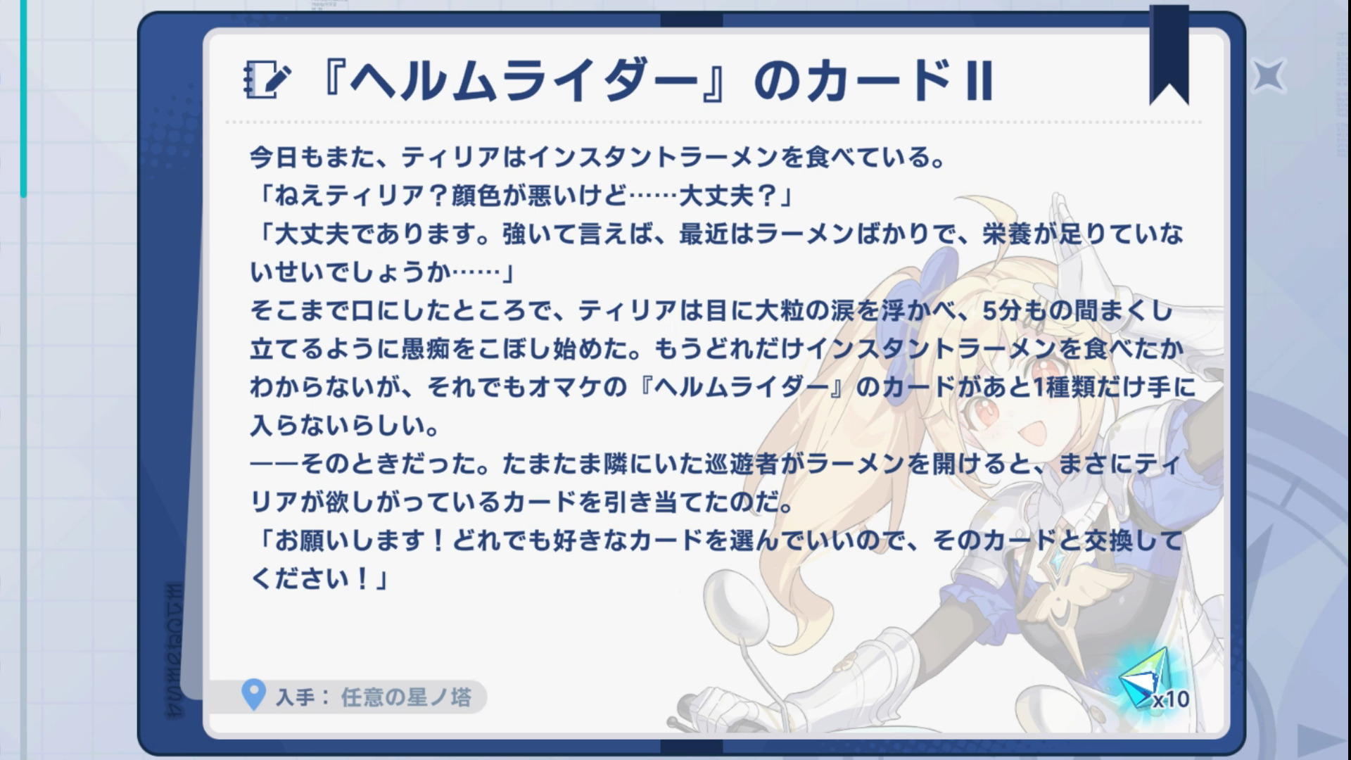 星ノ塔探索で入手できます。おそらく対象NPCとの対話が入手条件です。1枚解放するごとに