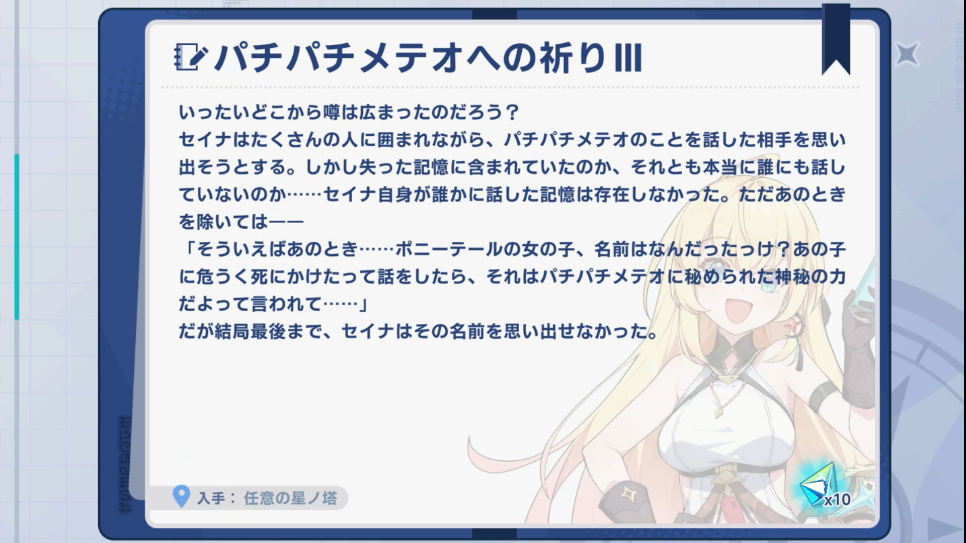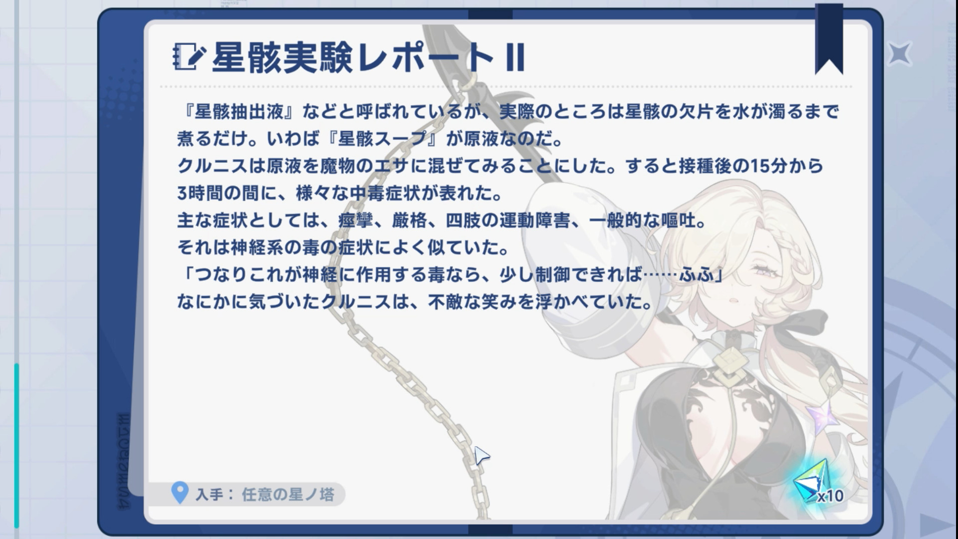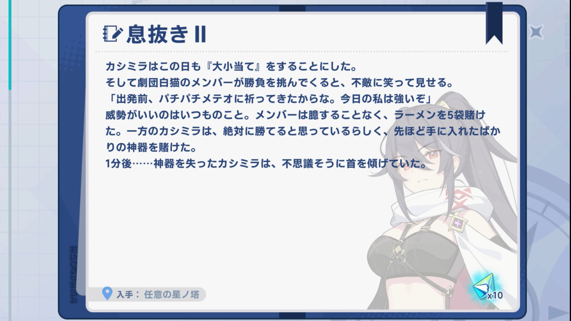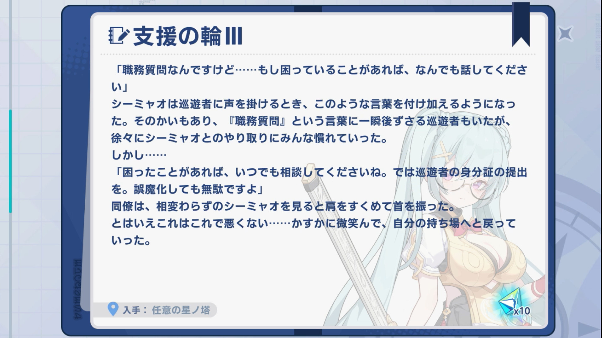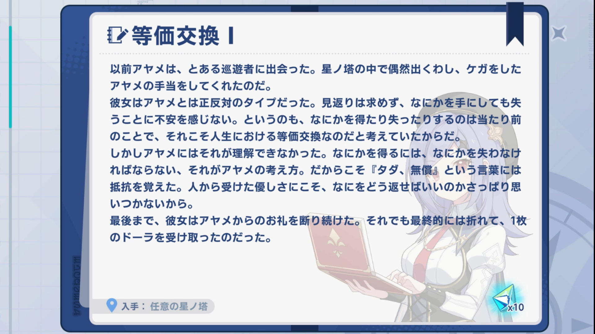 星ノ塔探索で入手できます。おそらく対象NPCとの対話が入手条件です。1枚解放するごとに