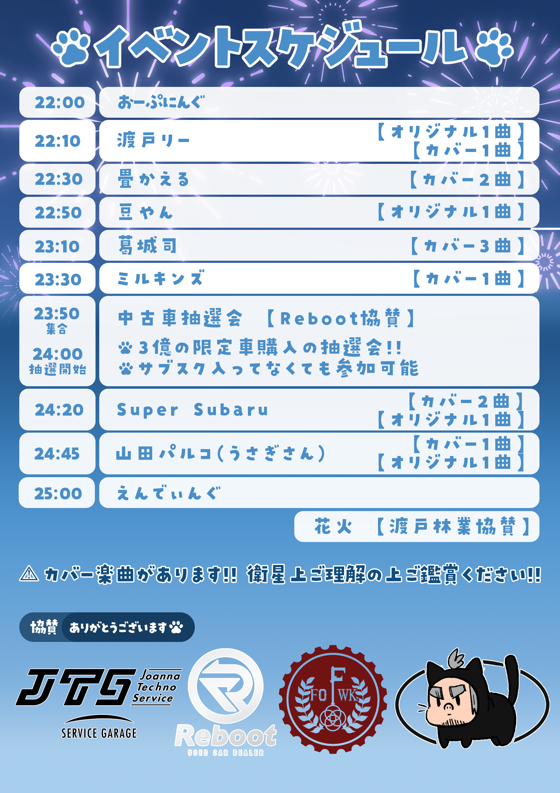 | 2025/01/16 | イベント出店 | 主催イベント「たいがの収穫祭 みにまむ!!」にて飲食販売 協賛:たいがのごはん/eight/UFORU/E5バーガー |