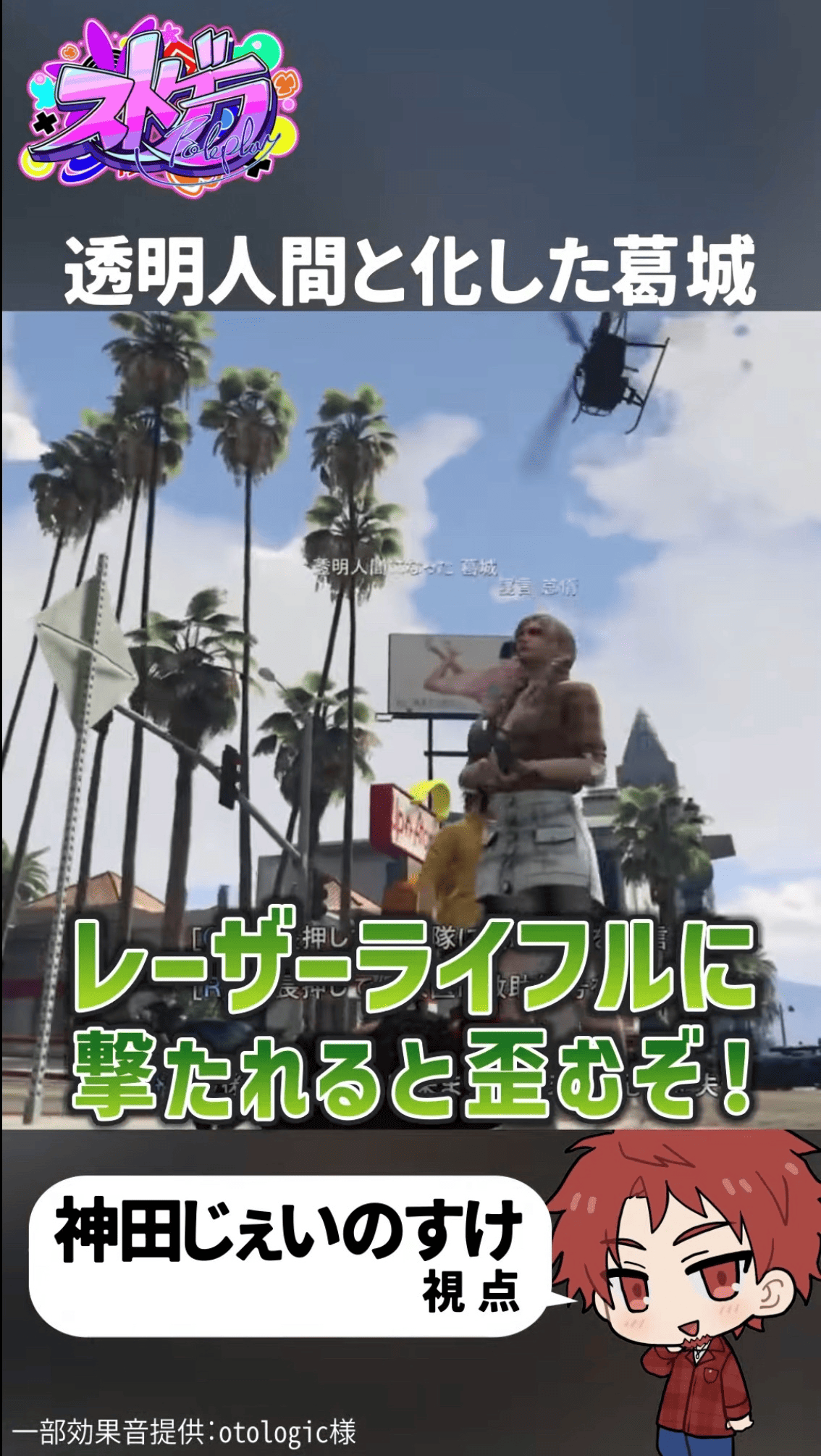 心は思春期男子 E5バーガー前のピエロとの戦闘中、 レーザーで撃たれて透明人間になった個人医葛城 司さんに治療してもらう様子をまとめたショート。 じぇいのすけのダウンに動揺する寝言 怠惰さんや、 ダウンした原因が まさかの人物 からの流れ弾と知り驚くじぇいのすけの様子も見られる |