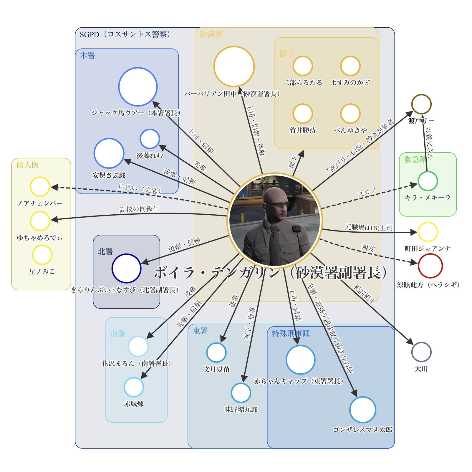 - ごつい外見ながら、新規住民や白、黒市民関係なく声を掛ける気さくな性格。しかし、空気感やラインを踏み間違えることもある。