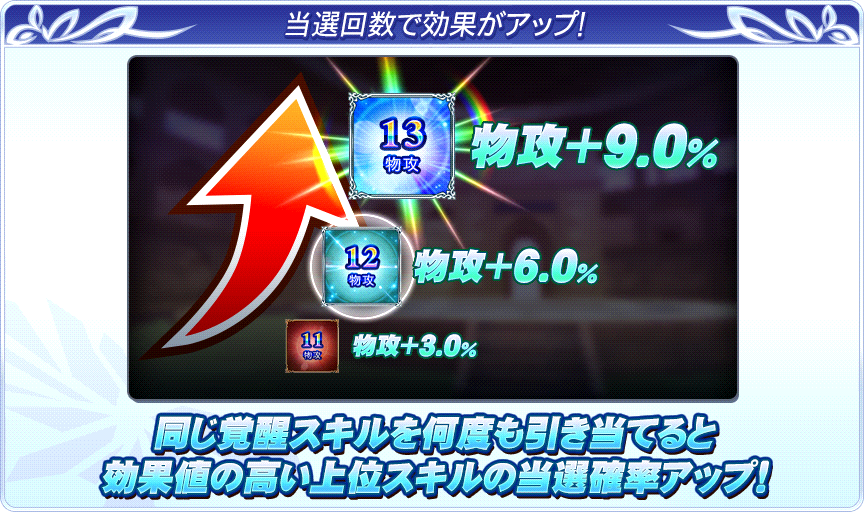 - 同じキャラで同じスキルを何度も引くと、上位ランクのスキル (◇1→◇2→◇3) が出やすくなる。スキルを入れ替えなくても引いた回数は増えるため、目当てのスキルを何度も引くことを優先するといい。