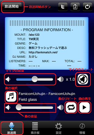 放送局のタブを開き左上の放送開始ボタンを押して放送を開始する
