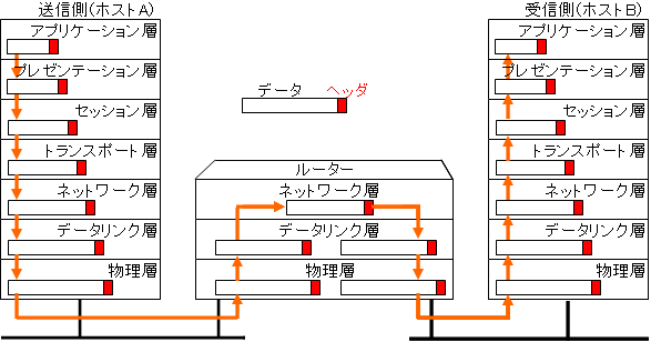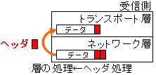 OSI参照モデルで、データ受信側がデータを層間で受け渡しする様子を、データとヘッダを明記して図示しなさい。