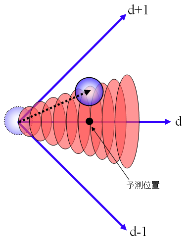 計算軸付近を計算して、移動物体があればその計算軸が方向になり、計算軸上の近い点が予測位置となります。