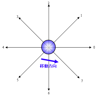 それだと一直線しか追跡できないので下図のように、物体の中心から放射状にのびる1次元方向の計算軸を8個用います。