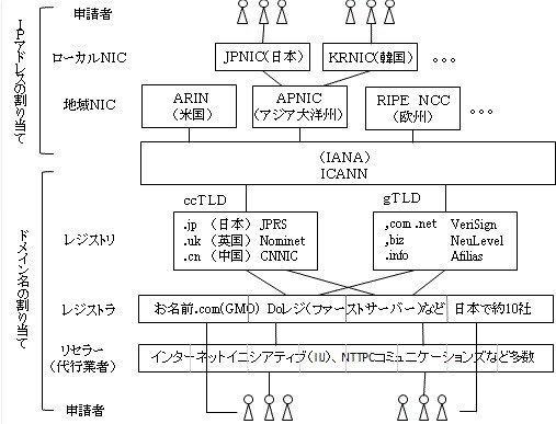 有限のIPアドレスを適切に割り当てたりドメイン名の重複を防ぐための管理組織が必要になる。世界全体を統括する組織がICANNである、IPアドレスは州レベルでの地域NIC→国レベルでのローカルNIC、ドメイン名ではレジストリ→レジストラ→リセラーの階層構造になっている。リセラーは「ドメイン取得サービス」業者で、「レンタルサーバーサービス」もしていることが多い。
