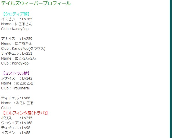 アナイス :Lv259 Name:にこるたん Club:KandyPop(クラマス) ティチェル:Lv251 Name:にこるんるん Club:KandyPop