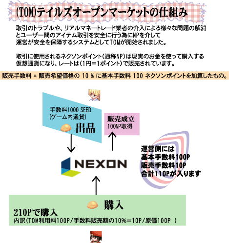 TOMは現実のお金を払って受けるサービスです。 現実のお金と交換できる仮想通貨:ネクソンポイント(通称)を使って 誰でも簡単にいつでも、サーバーのどこからでもアイテムの取引が出来ます。
