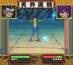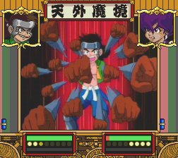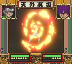 [↓]+[術ボタン] | 火炎龍 | 天を指さし「火炎龍!」 後ろに飛んで正面を指さすと 指先から現れた渦状の炎が龍に変化 龍の顔の中から本人が回転飛び蹴り |