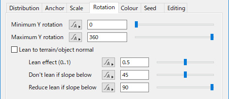 斜面が設定値より小さい場合、インスタンスの傾斜効果を減少します。完全に地形/オブジェクトに密接させたい場合、"Don't lean if slope below"と共に、この値を0にします。 |