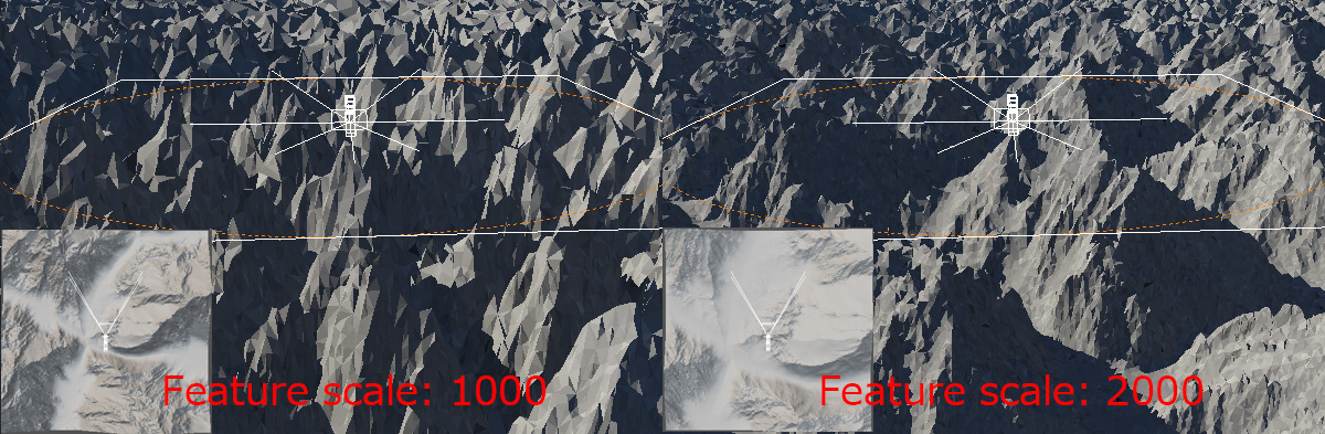 Feature scale | 特徴スケール | 地形の型状の平均サイズをコントロールします。フラクタルの主要な特徴は、このパラメータで発生し、フラクタル全体の中間的スケールを定義します。"Feature scale"よりも小さな特徴は振幅が小さくなります(ラフネスパラメータに応じた割合でスケールが小さくなるにつれて振幅は減少し続けます)。単位:メートル。![]() |