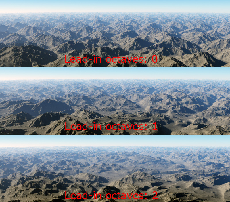 Lead-in octaves | リードイン・オクターブ | リードインオクターブは、"Feature scale"のオクターブと同じ振幅を持ちます。ラフネスパラメータは、"Feature scale"の下のオクターブを最小スケールまで減衰させますが、"Feature scale"の上のオクターブには影響しません。この追加のリードインオクターブは、"Feature scale"よりも大きいセルを追加します。どのくらい大きいかは、「Settings」タブの"Scale step"に依存します。(ただし、この設定では、小さなオクターブと大きなオクターブのスケール比もコントロールされます)。 例: Feature scale = 4000、"Scale step" = 3 Lead-in octaves 0 の時、最大セルは4000メートルの幅。 Lead-in octaves 1の時、最大セルは12000メートルの幅。 Lead-in octaves 2 の時、最大セルは36000メートルの幅。 "Lead-in octaves"のセルは、"Feature scale"で発生するセルと同じ変位振幅を持ち、異なる種類の方法で小さなセルの供給量にも寄与します。Lead-in Scareも参照して下さい。 ![]() |