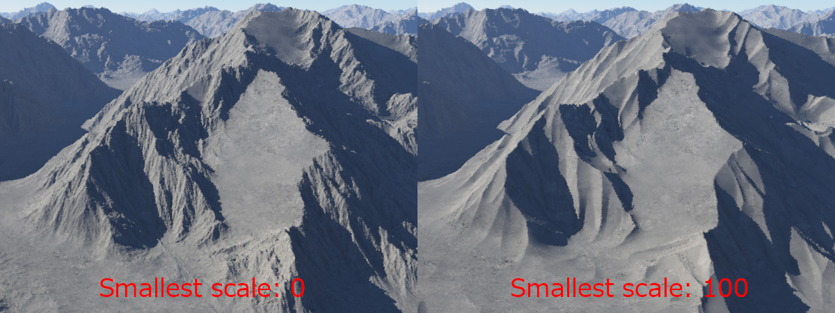 Smallest scale | 最小スケール | フラクタルは、無限のレベルまで細部を生成し続けるわけではなく、このパラメータでコントロールします。フラクタルはこのスケールの下にディテールを作成しません。これがあなたのサーフェスまたはテクスチャ内の唯一のフラクタルである場合、このスケールより滑らかになります。"Smallest scale"は"Noise octaves"の数に関連付けられているため、特定の値のみを使用する事が出来ます。一方を設定すると、もう一方の値が決められているため、どちらを変更しても相対するパラメータの値が分かります。これは他のスケール値を変更した時にも作用されます。![]() |