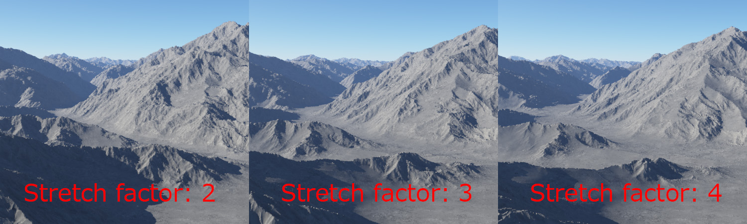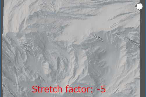 Stretch factor | 伸張要素 | フラクタルノイズを斜面に対して伸張します。伸張された地形は雨などによって浸食された様に平滑化します。数値の負と正は、どちらも数字が大きくなるほど伸張します。0は伸張の要素が無くなり地形が型を成さなくなります。![]() ![]() |