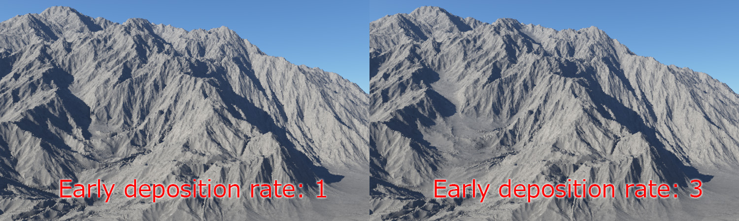 Early deposition | 初期堆積 | 山岳の傾斜に堆積する量をコントロールする事が出来ます。数値が高い程窪みがなくなり平滑化します。![]() |