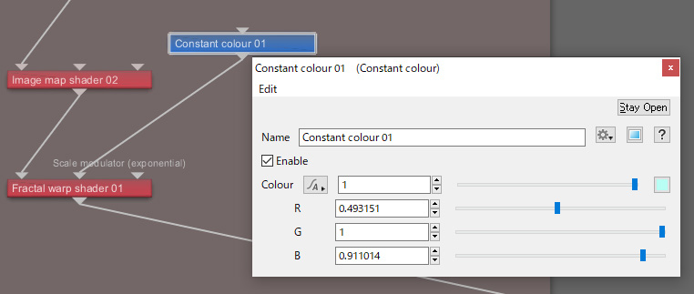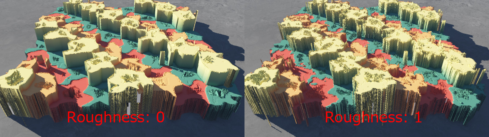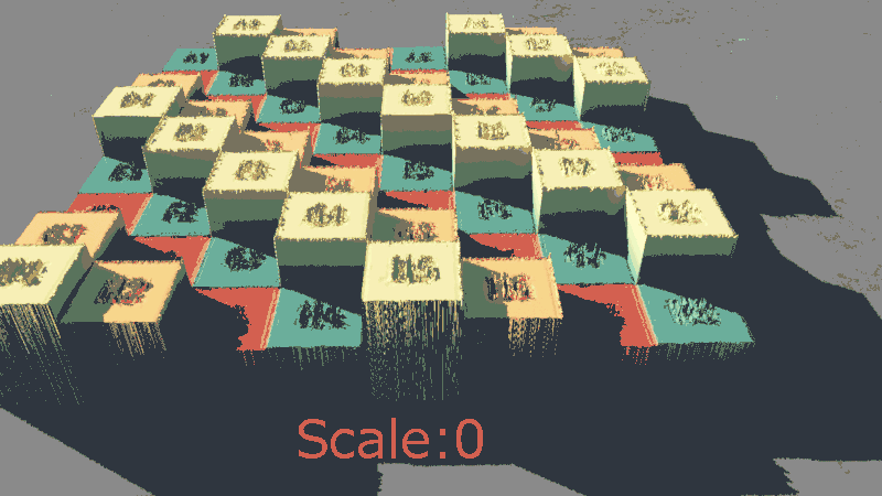Scale modulator | スケール・モジュレータ | 指数関数やシェーダを使って歪曲を調整する事が出来ます。スケール関数は定数値を持つ必要があります。それはテクスチャ空間をスケーリングするため、スケールの中に変動がある場合歪曲を起します。同時に多数のシェーダのスケールを全体的に変化させるのに便利な機能ですが、慎重に使用する必要があります。 また、原点(0、0、0)の周囲では問題ないように見えるかもしれませんが、原点を離れ遠くなるにつれて問題が生じます。スケーリングはテクスチャ空間をスケーリングする事によって行われ、スケーリングは原点を中心に処理します。原点から5メートルの位置で10%の変化は、見た目を最大0.5メートル歪ませますが、原点から5Kmでは、最大500メートル歪めてしまいます。この異変はすぐに気付くでしょう。 ![]() ![]() ![]() 『Fractal Warp Shader』の「Scale modulator」に、『Constant colour』を割り当てたサンプル。 |
