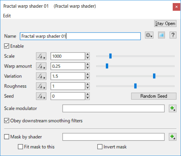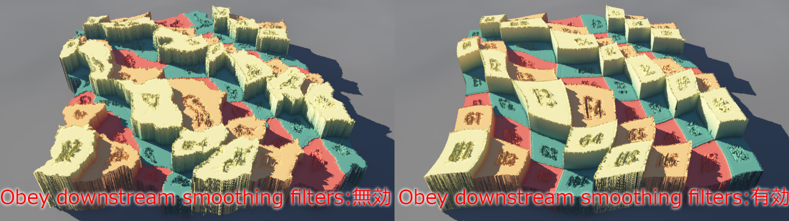 Obey downstream smoothing filters | 下流のスムージングフィルタに追従 | チェック時、ノード下に追加した『Smoothing filter shader』ノードの効果を有効します。『Smoothing filter shader』で大きな値を設定すると、歪曲の効果はすべて相殺されてしまいます。![]() |