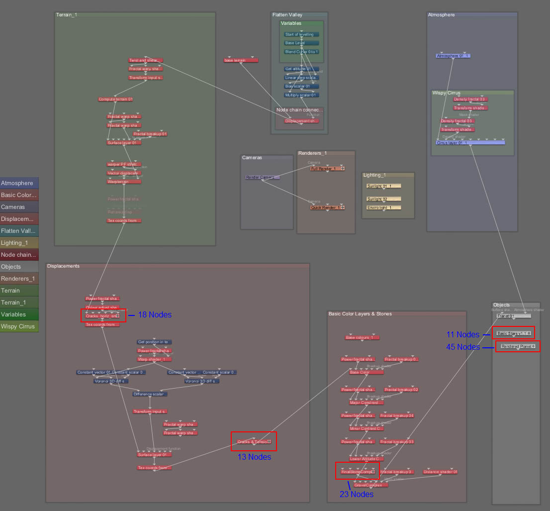 雲のクオリティを下げてロバストアダプティブサンプラーを有効にすると、空は実際にかなり速くレンダリングされましたが、地形はなおもかなり低速でした。そこで、私は地形のディスプレイスメントネットワークの一部を無効にするレンダリングを数回行い、レンダリングにかかる時間を確認しました。興味深い事に、いくつかのジオメトリの不連続性を引き起こすいくつかの激しいディスプレースメントがありますが、大規模な地形のディスプレースメント、折り重なりなどは、ここでの地形レンダリング時間の最大の要因ではありません。実際には、"Basic Color Layers & Stones"グループ、特に"FinalStoneComplex_4"が主な原因です。