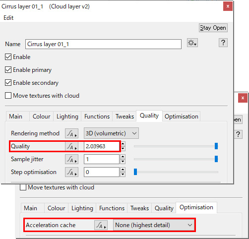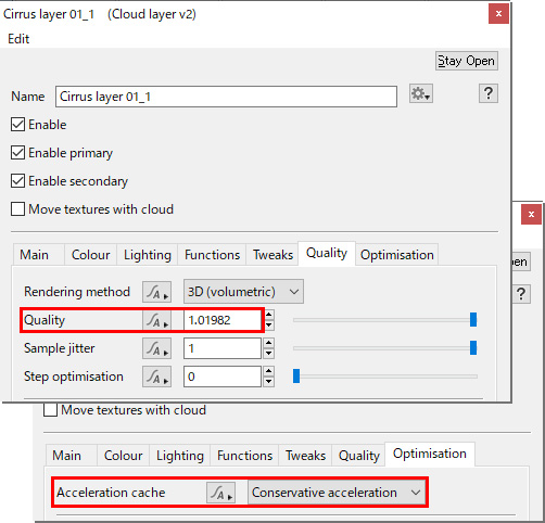 ここでの標準レンダリングでも、レンダリング時間に与える大きな影響の1つは、雲層です。クオリティを2にしていますが実際にはメリットがありません。1のクオリティで問題ない事が分かり、gao_jian11氏が言ったように0.5でも上手くいくようにも思いますが、ノイズが少なくても、クオリティが1レベルのディティールを目に見えて失うかもしれません。このような薄い雲(深さ100メートル未満)については、一般的に比較的低いクオリティレベルで問題ありません。また、"Conservative Acceleration"を有効にしてもレンダリングのクオリティに悪影響が出ない事を発見し、時間を節約しました。高レベルの加速は、"Optimal(最適)"であっても、レンダリングによるチラつきゴミを引き起こす事があります。そのため、雲のクオリティを1に設定し、"Conservative Acceleration"を有効にしました。一般的に、これらは他のシーン、特に『Cloud layer v2』で目指す安全な値です。