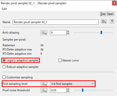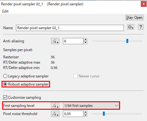 注意すべきもう一点は、上記ガイドで説明されているように、より高い適応性を使用すると、非常に細かい、ピンポイントの明るい、一方または両方の「ノイズのある」領域の強度が低下する傾向がある事です。これらの種類のピンポイントの明るい場所が実際に望ましいレンダリング状況は比較的少数です(多くのレンダラーの同類のレンダリングによるごみなどは実際には「ファイアフライ(ノイズ)」と呼ばれ、それらを除去するための多くの手法が存在します)。しかし、シーン内のプロシージャルの星シェーダ(『Basic Stars v1.1 by WASasquatch』)の場合、明るいポイントは"要望通り"であり、1/256および1/64の最初のサンプルでも大幅に最小化されます。これにはいくつかの解決策があります。