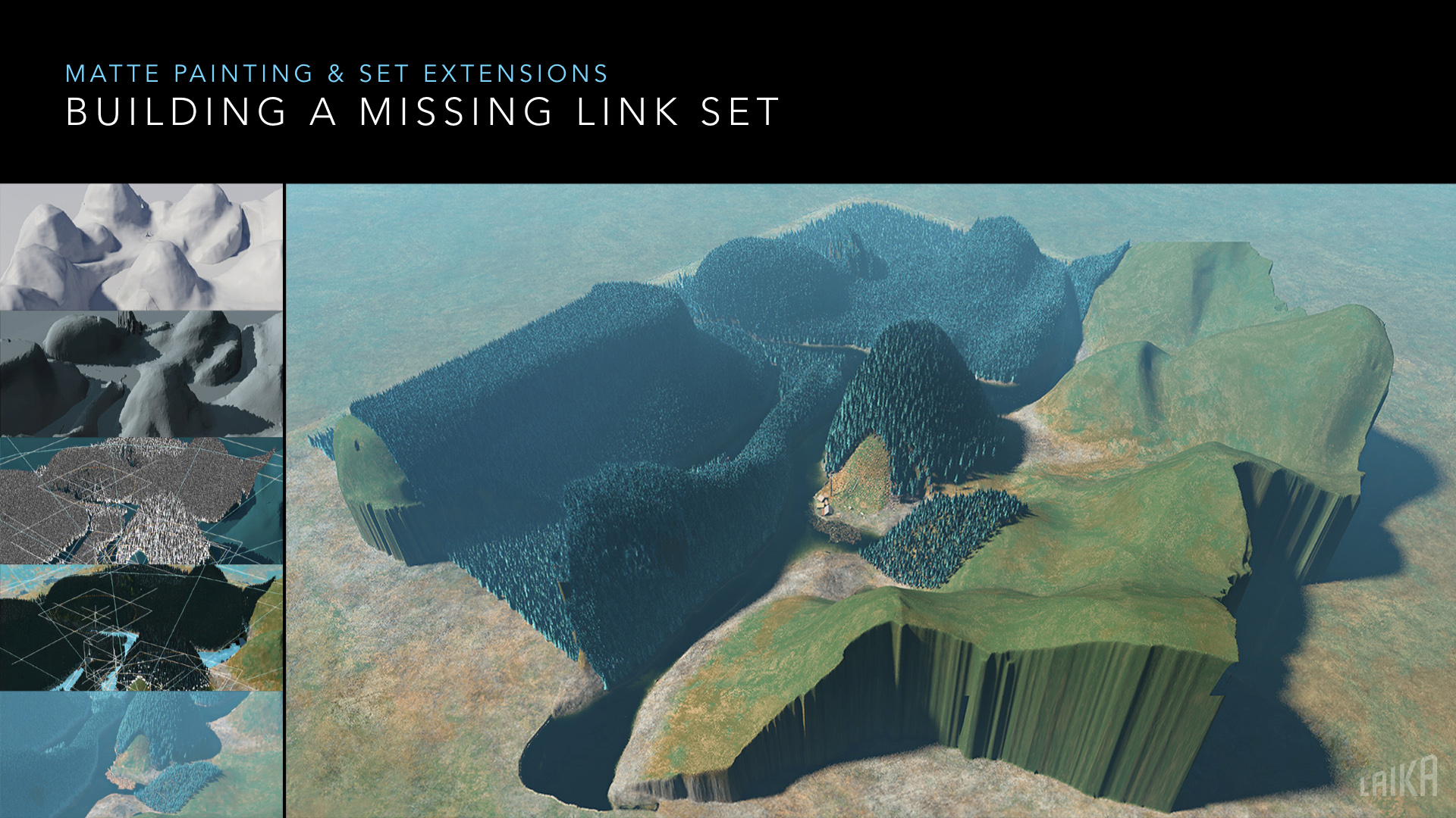 カメラをTerragenにインポートする事で、コンセプトアートに基づいたラフなセットをモックアップし、ラフな照明や大気を区分けする事が出来ました。これは通常、地形の様々な部分を定義する単純な形状と、木や植物、シーケンスに関連する他のアセットを表示させるために散りばめられた粗い