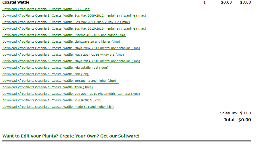 現在、XfrogPlantでは月替わりで各種植物のモデルデータの試供を無料で行っております。まず、アカウント登録を行い、試してみたいオブジェクトをカートに入れ、チェックアウトで清算します。0円の請求画面の後、メールにて各アプリケーションのファイル形式別にダウンロードのリンクの一覧が届きます。Terragenのネイティブファイル(.