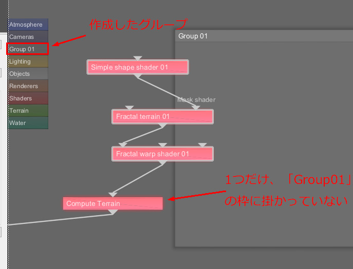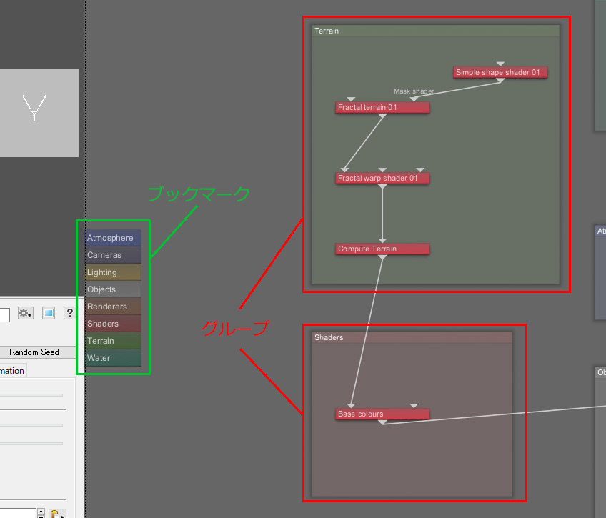 まず、ノードをグループ化して、ノードネットワーク枠の左側に表示されるブックマークを作成するTerragenの機能について説明します。Terragenのデフォルトでは、TerrainやAtmosphereグループなどのように、いくつかのノードがすでにグループ化されています。